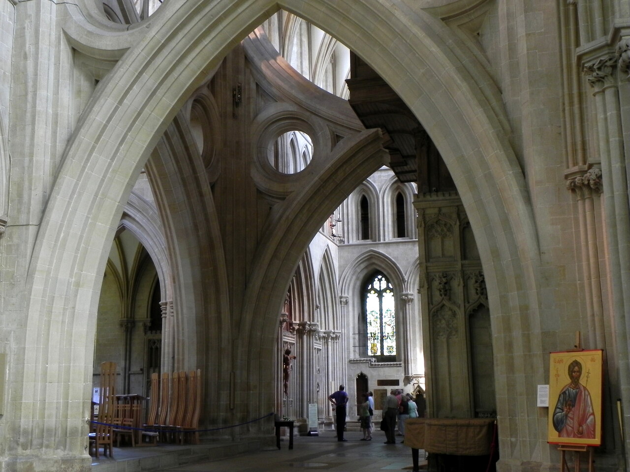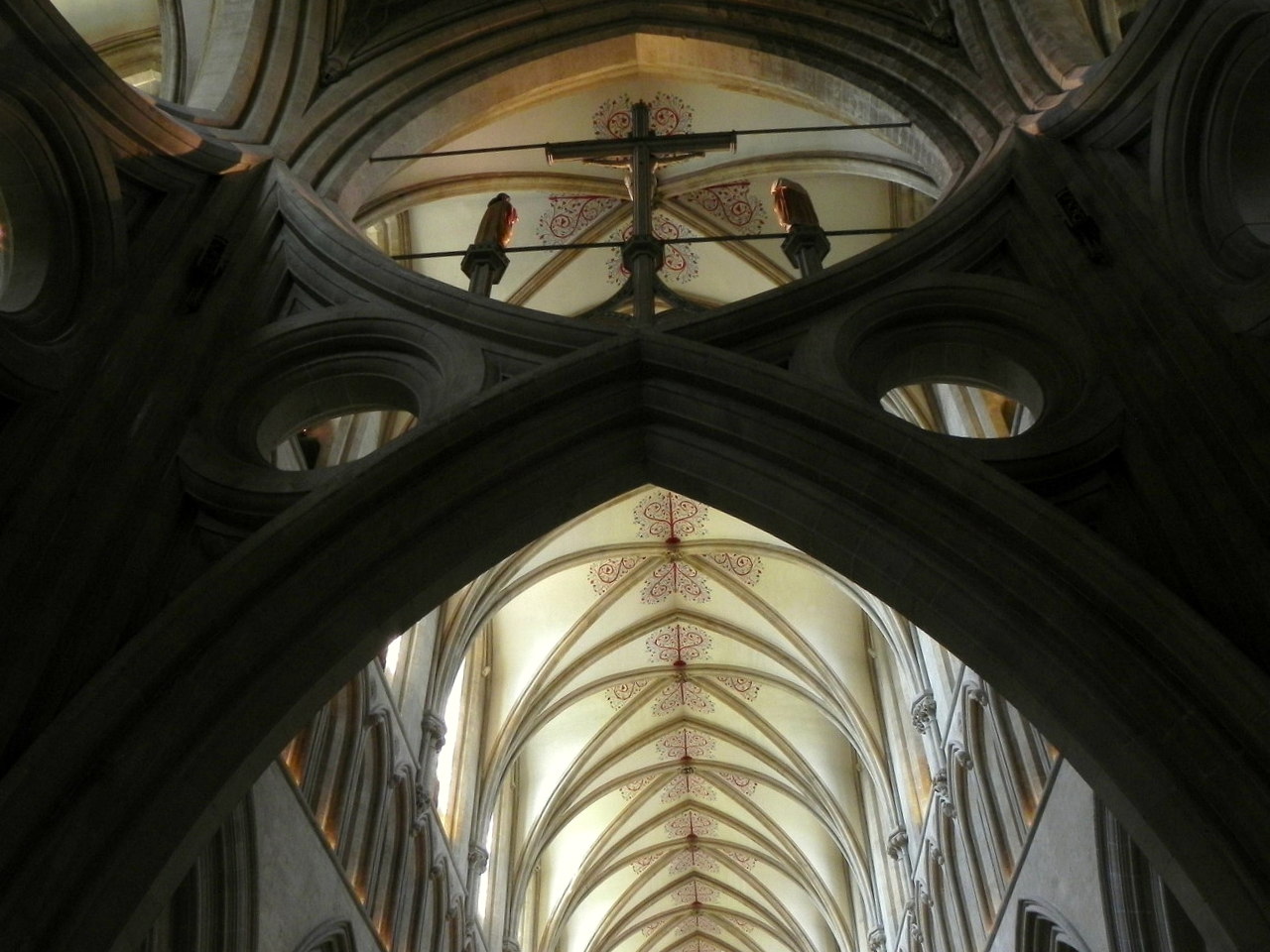 Wells, katedra - łuki nożycowe z grupą ukrzyżowania na łuku tęczowym