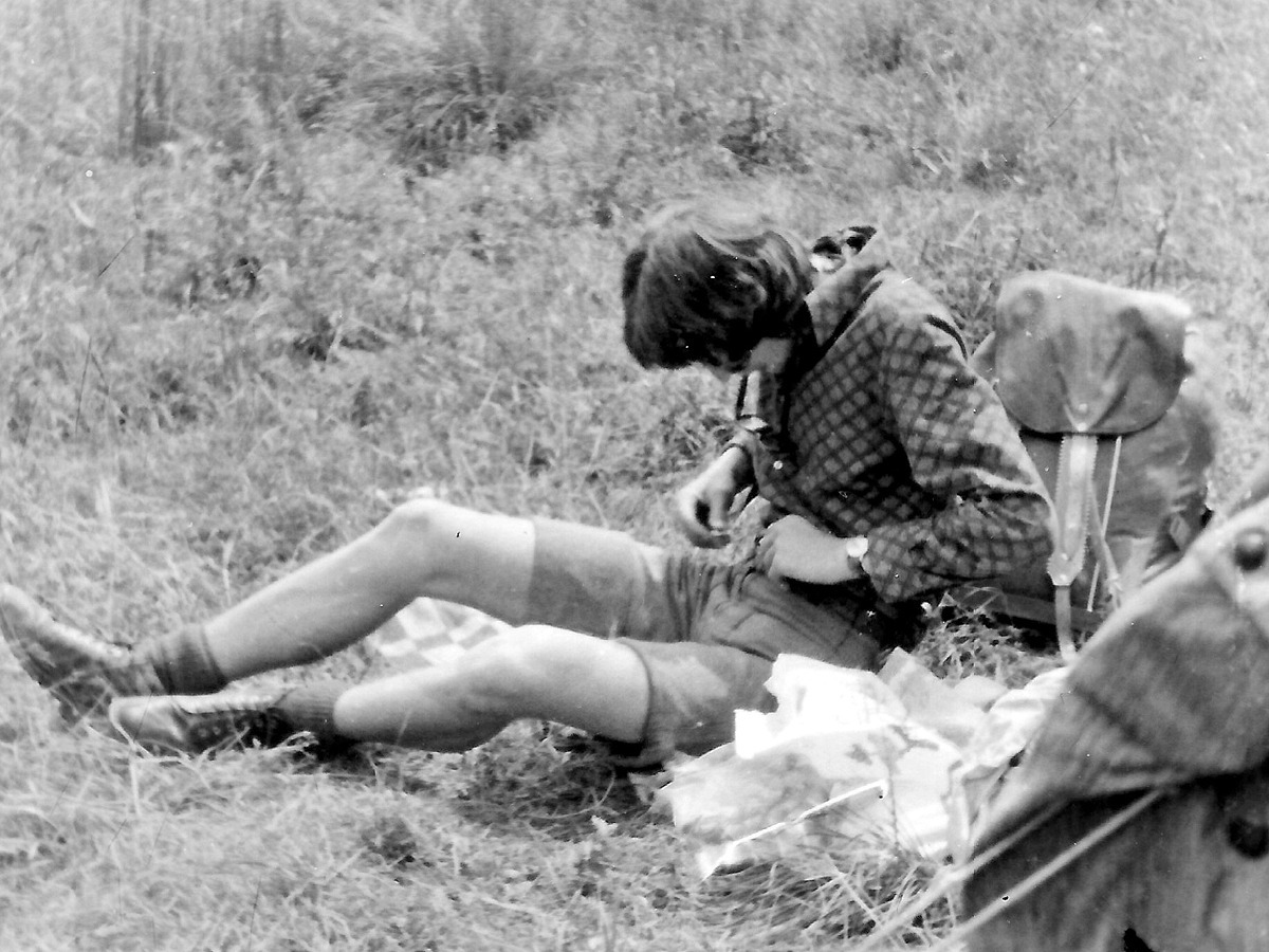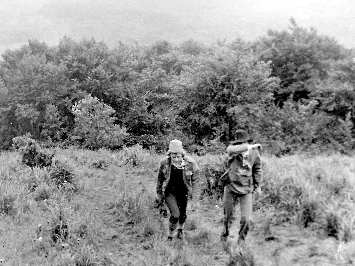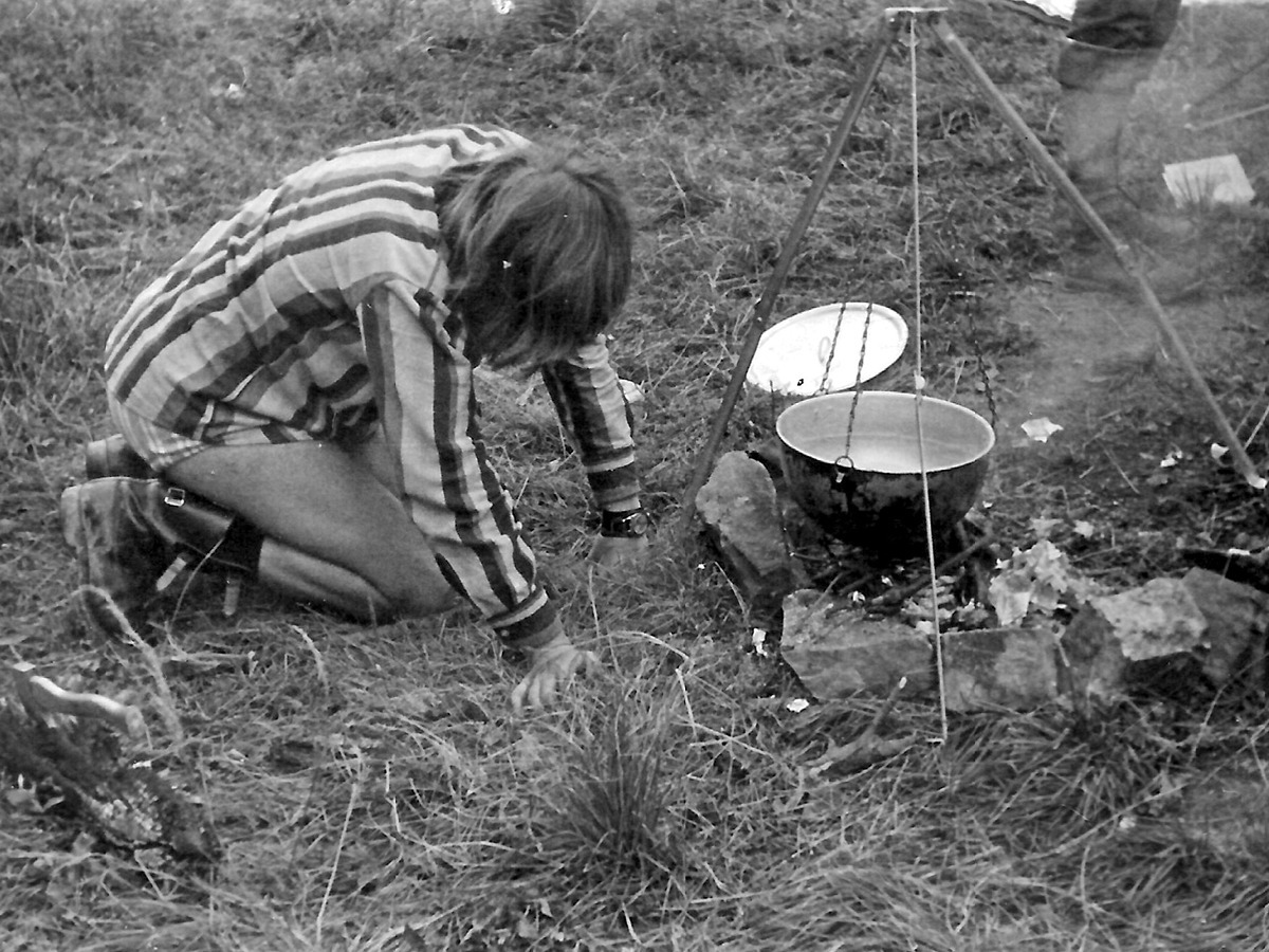 16 VII idziemy z Komańczy przez jeziorka Duszatyńskie i Chryszczatą na przełęcz 816, gdzie rozbijamy namioty. Na przełączy miało być źródełko, ale okazało się, że woda sączy się lekko po zeszłorocznych liściach. Łapiemy ją więc w przykrywkę od menażki. Nie dźwigamy z sobą butli z gazem, bo postanowiliśmy gotować w dużym garze nad ogniskiem. Już po ciemku, gotujemy więc zupę z wpadającymi do niej owadami, a później wodę na herbatę.