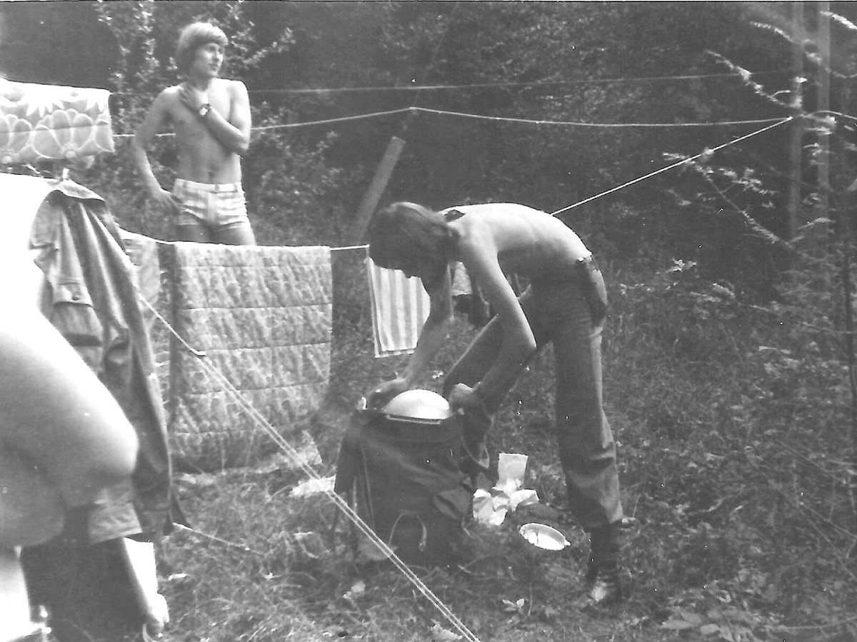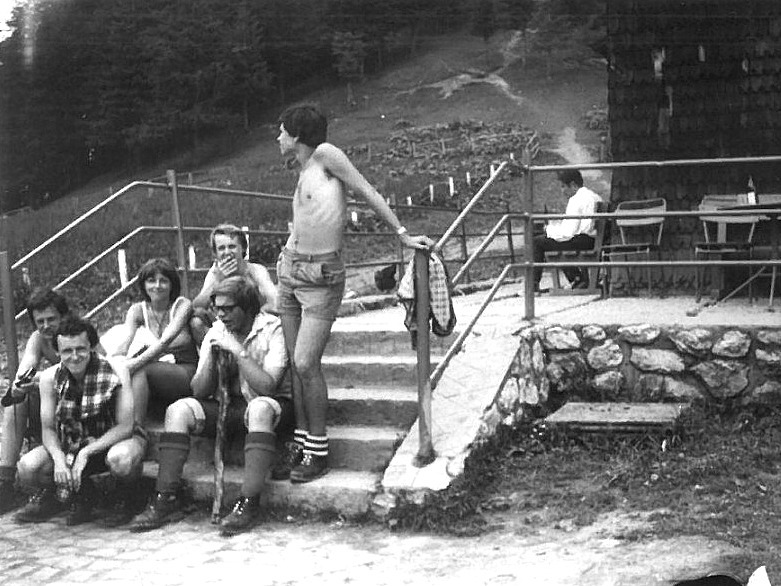 19 VII rano, gotujemy na śniadanie „słynną” zupę pomidorową - na puszeczce koncentratu z ryżem błyskawicznym. Piotr ma garstkę ryżu, ale zapewnia nas, że na 8 chłopa wystarczy – bo spęcznieje. Wyszło po łyżeczce na osobę. W planach mamy połoninę Wetlińską, więc trzeba się spieszyć. Ktoś pamięta, że przy parkingu w Górnej Osadzie, przy początku szlaku, jest budka z kiełbaskami. Zostawiamy więc bagaże w namiotach, i przy psującej sie pogodzie, idziemy szosą, z nadzieją na śniadanie przy parkingu. Na nasze szczęście budka była, więc jemy po kiełbasce z bułką (M.K. i J.Z. – po dwie). Pogoda pod psem, ale wchodzimy na połoninę Wetlińską.
